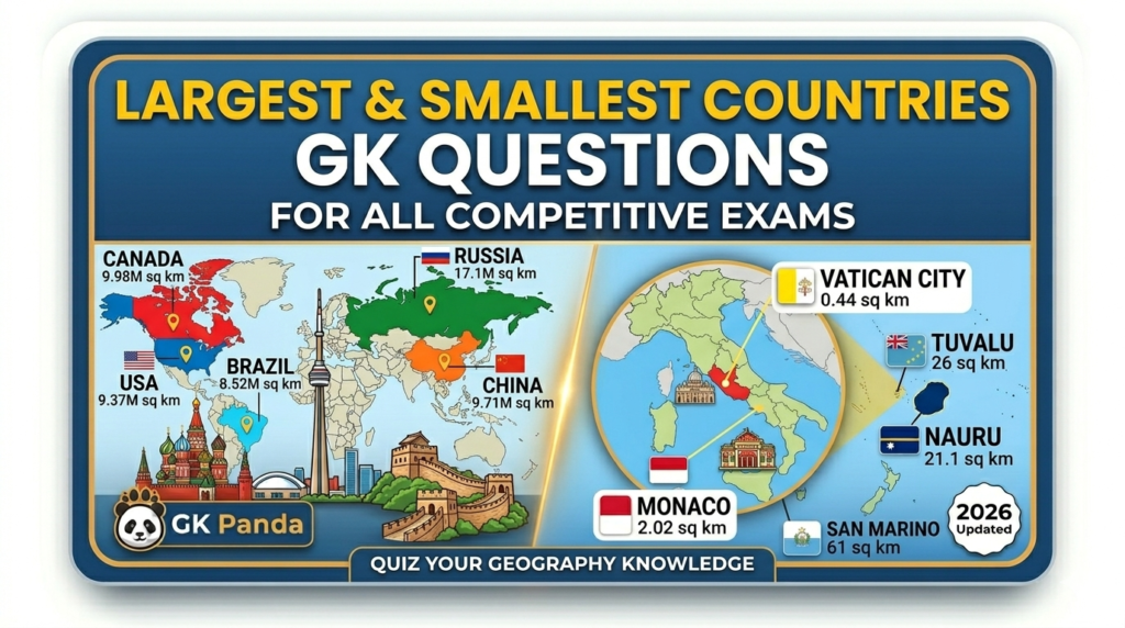 हमारा ग्रह पृथ्वी इतनी बड़ी है की न जाने कितने देश और उनकी राजधानी मौजूद है | यहाँ विशाल महाद्वीपों से लेकर नन्हे द्वीपों तक, सब कुछ है। इसी तरह, दुनिया में कुछ देश इतने बड़े हैं कि वे पूरे महाद्वीपों को कवर करते हैं, जबकि कुछ इतने छोटे हैं कि वे एक शहर के बराबर भी नहीं हैं। इस Largest or Smallest Country के सवालों में, हम दुनिया के सबसे बड़े और सबसे छोटे देशों के बारे में जानेंगे | Load More Questions